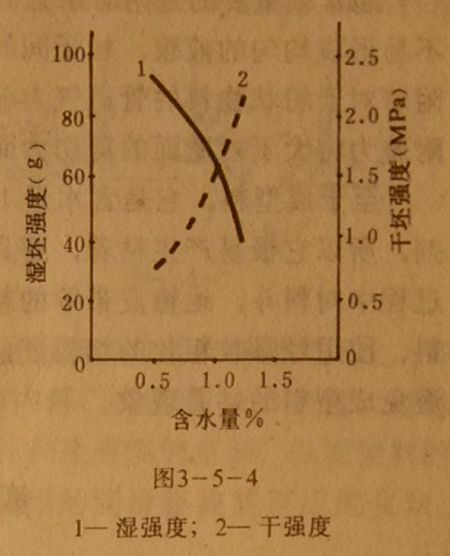 就陶瓷磨具成型料而言,磨具坯的濕坯強(qiáng)度與干坯強(qiáng)度,在其他條件相同時(shí),與成型料的潤(rùn)濕狀態(tài)有關(guān).多次試驗(yàn)表明,對(duì)于同一種成型料,其他條件均相同,僅改變其干濕程度,較干(但仍能成型)的成型料,有著較高的濕坯強(qiáng)度和較低的干坯強(qiáng)度,而較濕的成型料,其濕坯強(qiáng)度低但干坯強(qiáng)度高,見(jiàn)圖3一5-4.