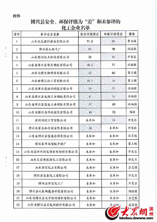 于淋凡)根據(jù)濱州市化工產(chǎn)業(yè)安全生產(chǎn)轉(zhuǎn)型升級領(lǐng)導(dǎo)小組辦公室《關(guān)于嚴(yán)格貫徹落實(shí)魯化安轉(zhuǎn)辦【2017】1號文件的通知》(濱化安轉(zhuǎn)辦【2017】1號)要求。7月初,博興縣政府決定對全縣環(huán)保、安全結(jié)果為“差”的企業(yè)和未參加“評級評價”的22家化工企業(yè)(名單附后)進(jìn)行停產(chǎn)整改。