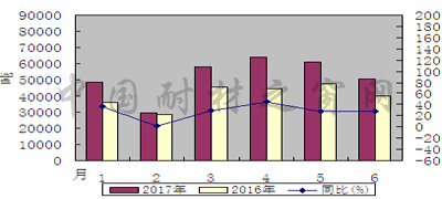 2017年1-6月,我國(guó)棕剛玉出口總量約為31.19萬(wàn)噸,較去年同期增長(zhǎng)29.2%,出口總金額約18546.98萬(wàn)美元,同比增長(zhǎng)16.1%。其中6月份棕剛玉出口總量約為5.08萬(wàn)噸,同比增長(zhǎng)28.1%;出口金額約為3019.76萬(wàn)美元,同比增長(zhǎng)16.1%。